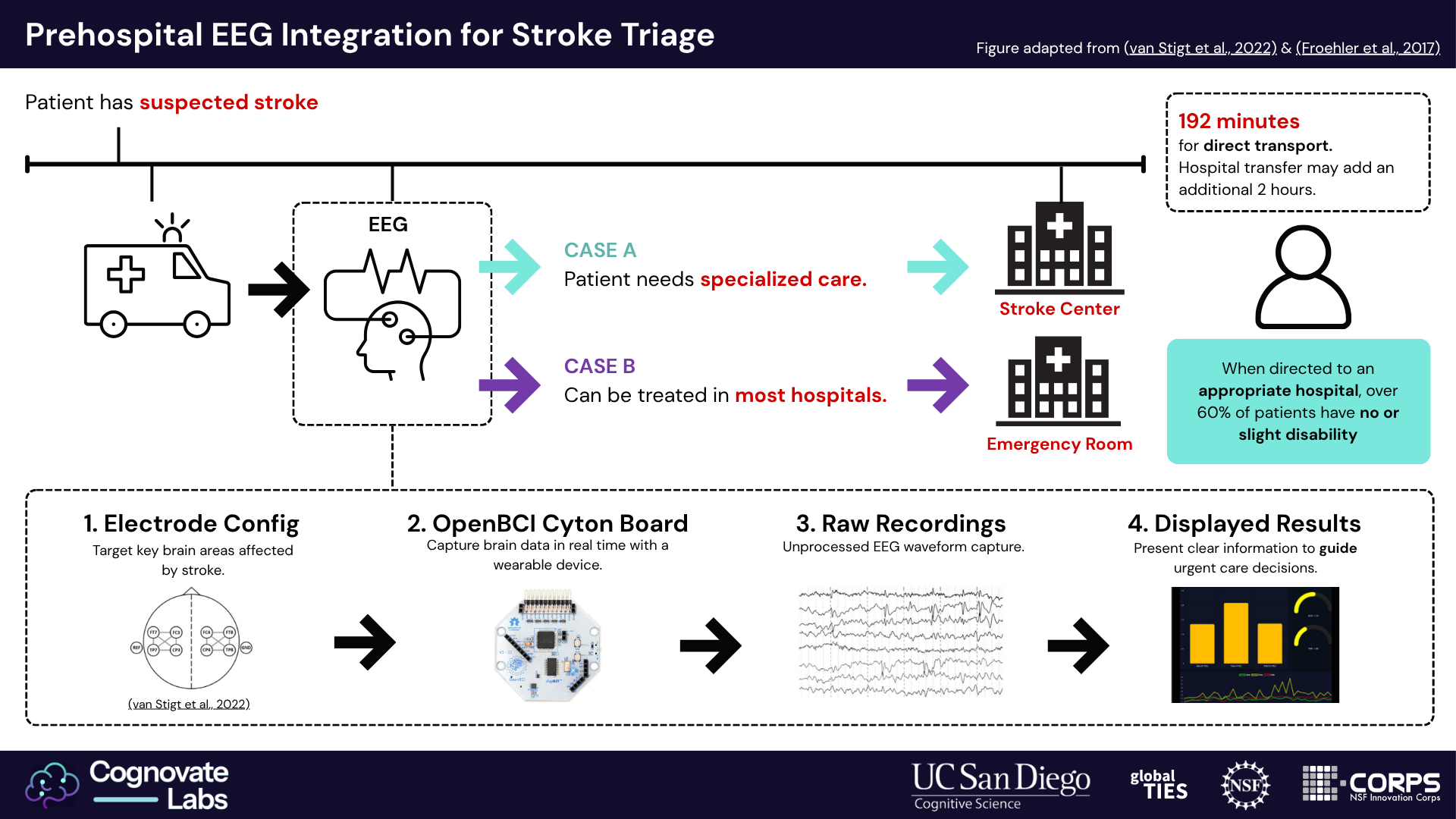 40% of strokes are Large Vessel Occlusion (LVO), which require treatment only available at specific hospitals. Every 30-minute delay before initiating treatment lowers patient outcomes by 7%. Current ambulance protocol rushes patients to the nearest hospital. Taking patients to the incorrect hospital produces a median delay of 109 minutes. Cognovate Labs is developing a pre-hospital EEG device to provide real-time cognitive insights that cannot be identified through conventional stroke assessments. Our device enables an informed decision to take patients directly to the appropriate care center, thereby increasing the number of patients who achieve functional independence after recovery.