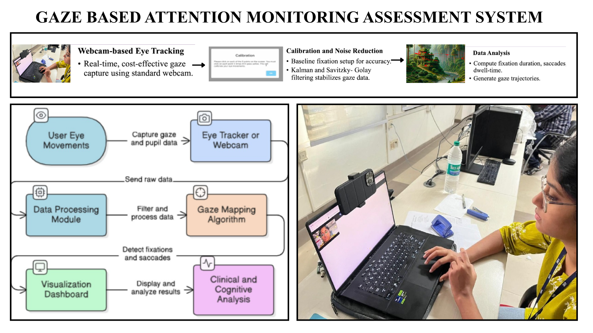 This project uses real-time gaze-tracking technology where visual attention is monitored & analysed. WebGazer.js like technologies make the use of standard webcam possible and cost effective. This solution is for education, healthcare, & HCI. During calibration, participants fixate on points to produce baseline gaze data to ensure individuality & accuracy. Participants fixate on specific images with instructions. Integration of Kalman filtering minimizes noise and stabilized gaze data. Heat maps and visuals are generated that present the gaze intensity, assist in understanding trends. This project has made a step in enhancing human attention.